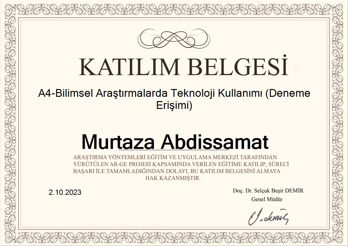 Gazi Üniversitesi Yapay Zeka Topluluğu және ACM Gazi бірлесіп ұйымдастырған Web Programlama (Front-End Development) оқу бағдарламасына қатысып, оны сәтті аяқтағаны туралы сертификат.