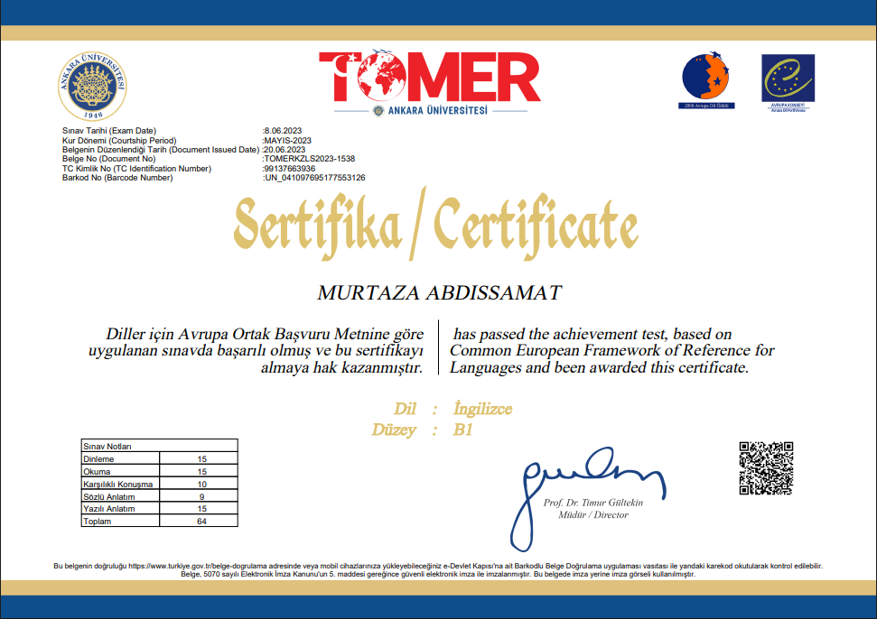 Ankara Üniversitesi TÖMER орталығы өткізген Common European Framework of Reference (CEFR) стандарты бойынша ағылшын тілі деңгейін анықтау емтиханынан өтіп, B1 деңгейін растаған сертификат.