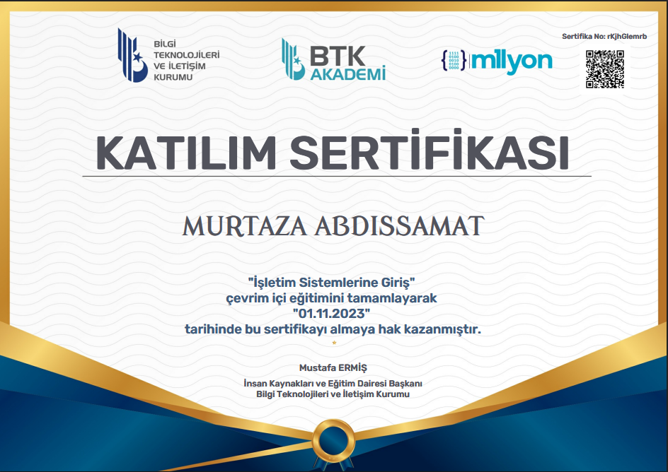 Bilgi Teknolojileri ve İletişim Kurumu (BTK) Akademi платформасында ұйымдастырылған “İşletim Sistemlerine Giriş” атты онлайн курсты сәтті аяқтағаны туралы сертификат.