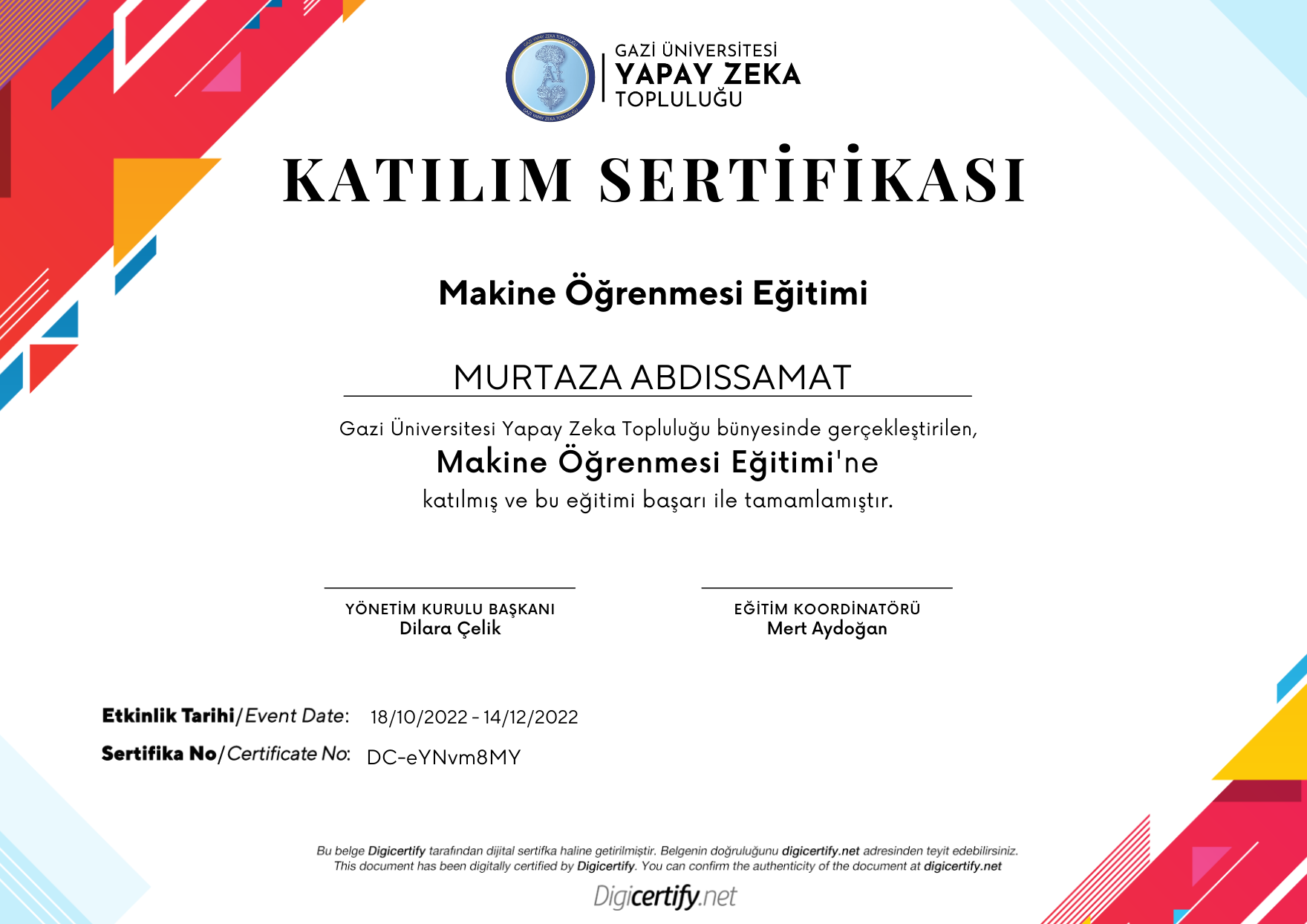 Gazi Üniversitesi Yapay Zeka Topluluğu ұйымдастырған Machine Learning оқу бағдарламасына қатысып, оны сәтті аяқтағаны туралы сертификат.