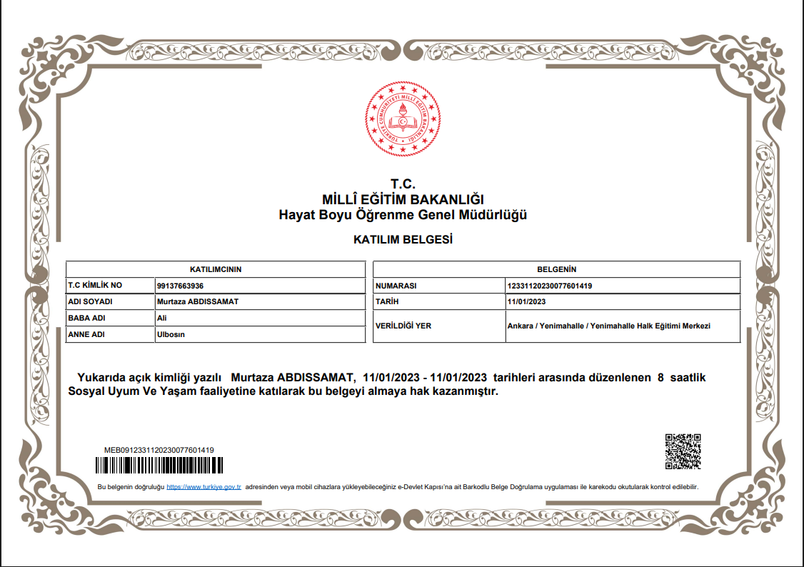 T.C. Millî Eğitim Bakanlığı Hayat Boyu Öğrenme Genel Müdürlüğі ұйымдастырған "Sosyal Uyum ve Yaşam" атты 8 сағаттық оқу бағдарламасына қатысқаны туралы сертификат.