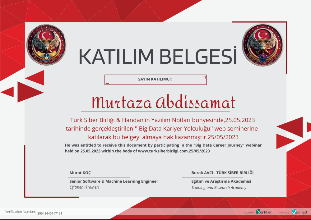 Türk Siber Birliği және Handan'ın Yazılım Notları ұйымдастырған “Big Data Kariyer Yolculuğu” вебинарында қатысқаны үшін берілген қатысу сертификаты.