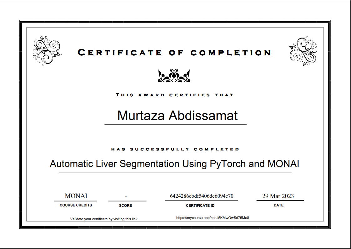 PyTorch және MONAI кітапханаларын қолдану арқылы медициналық кескіндерден бауырды автоматты сегментациялау әдістерін үйрену бойынша курсты сәтті аяқтағаны туралы сертификат.